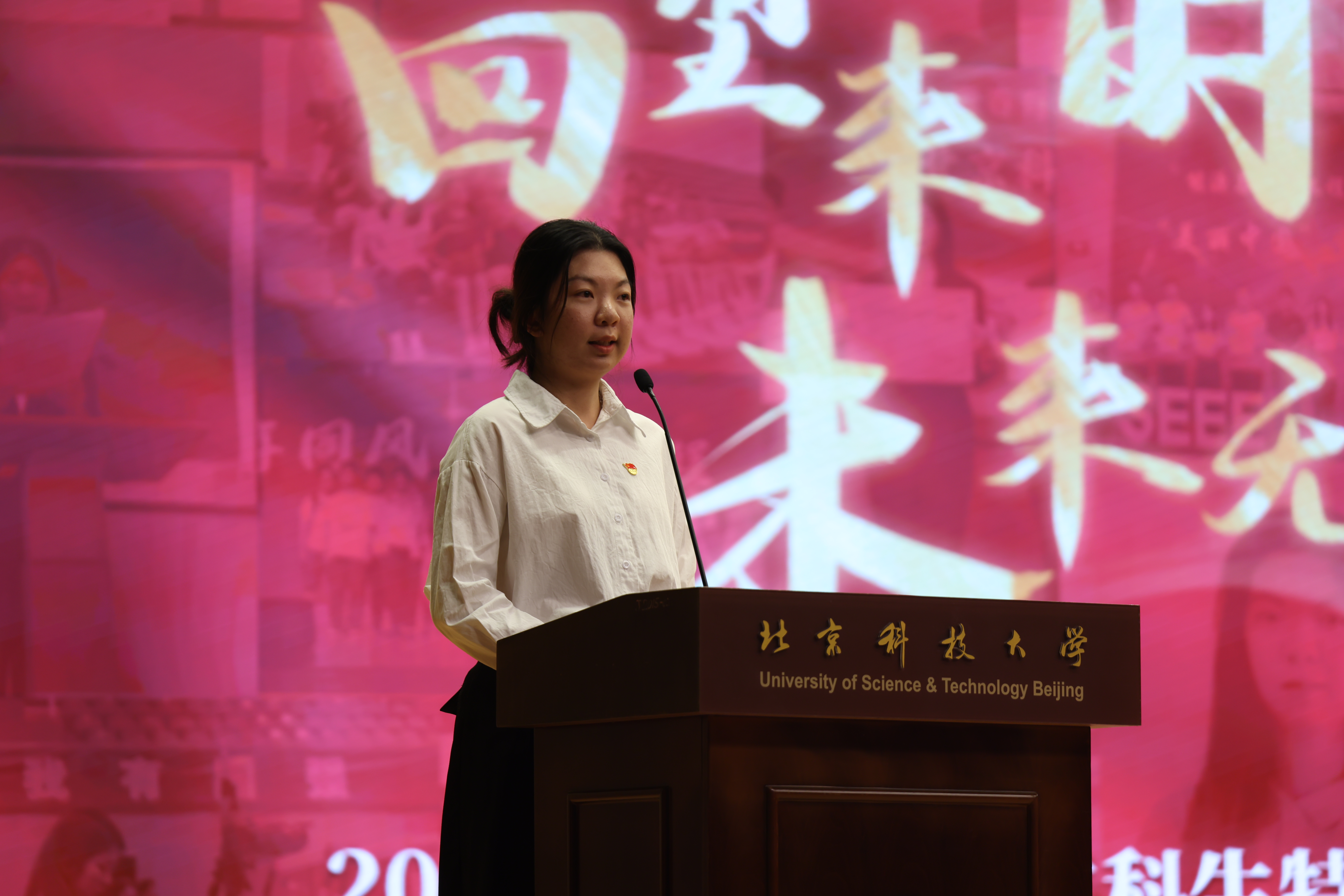 候选人答辩环节结束后,北京科技大学2024-2025学年小米特等奖学金获得者、2022级本科生孙智颖进行交流分享,她鼓励新生用“忘我的奋斗、有我的担当、超我的信念和无我的情怀”扎根专业领域,助力能源革命,服务双碳战略,为建设天蓝、地绿、水清的美好家园贡献能环力量。