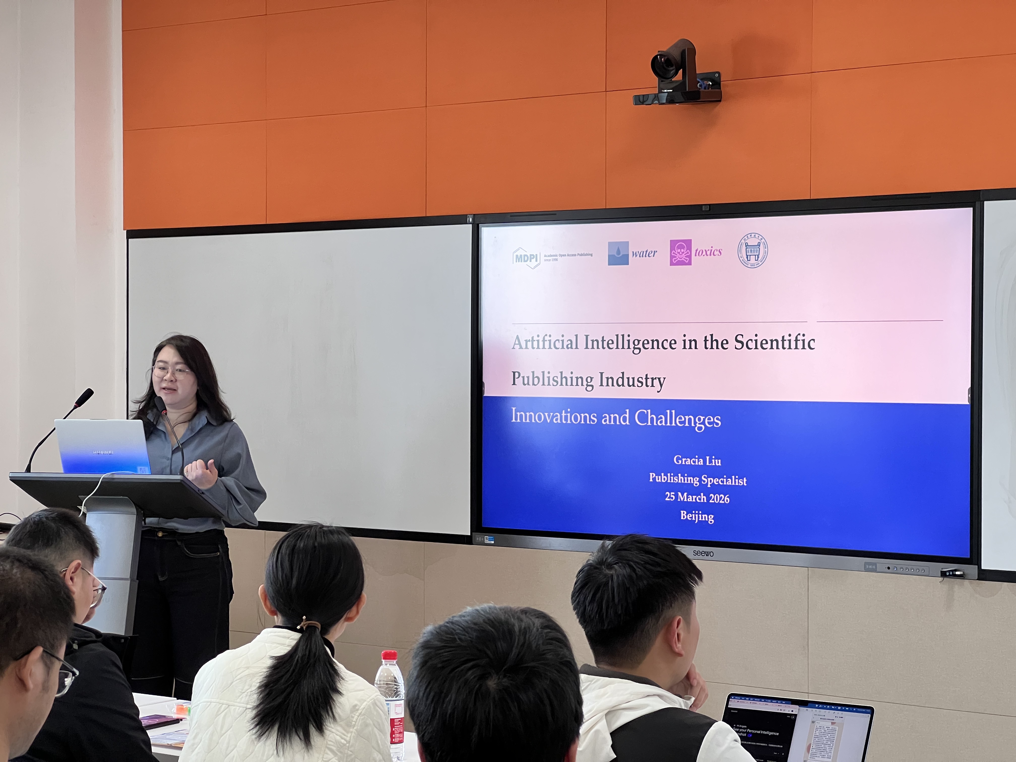 活动伊始,曼迪匹艾Water期刊出版专员刘泾泾以“人工智能与出版”为题展开分享。结合Water期刊在水资源领域的研究方向,她详细阐述了人工智能技术在学术出版中的应用场景,包括论文数据筛选、审稿效率提升、选题趋势预测等,结合MDPI旗下期刊的实践案例,展现了科技赋能学术出版的前沿趋势,为师生学术成果发表提供了新思路。