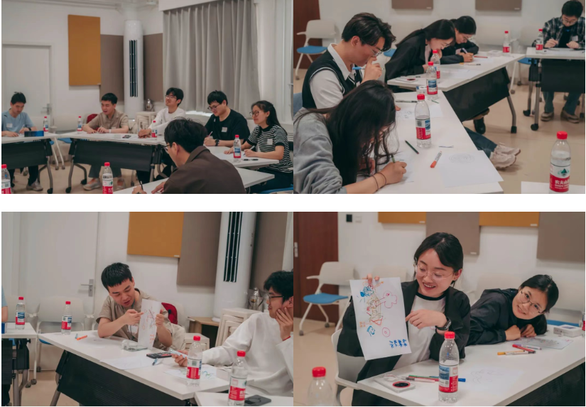 针对活动主题,顾耘宇老师带领同学们开展了“信手涂鸦”“情绪连线”“冥想休憩”三个环节。 “信手涂鸦”环节中,同学们分别用惯用手与非惯用手绘制线条与抽象涂鸦,通过观察图案、勾勒填色及作品传递,感知情绪的表达与转化。在创作和传递中,顾老师启发同学们情绪本身没有好坏之分,要学会觉察情绪、转化情绪。‘