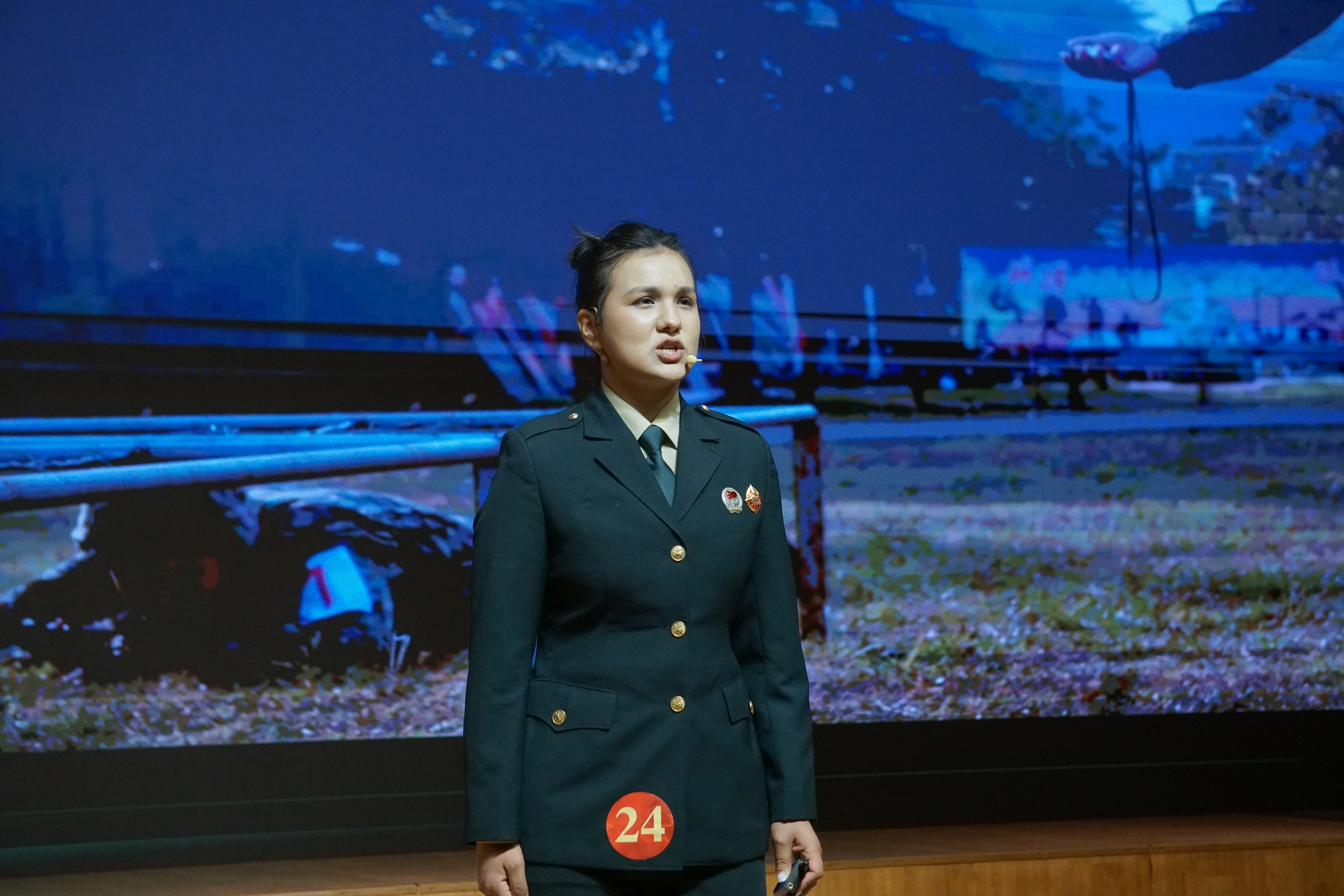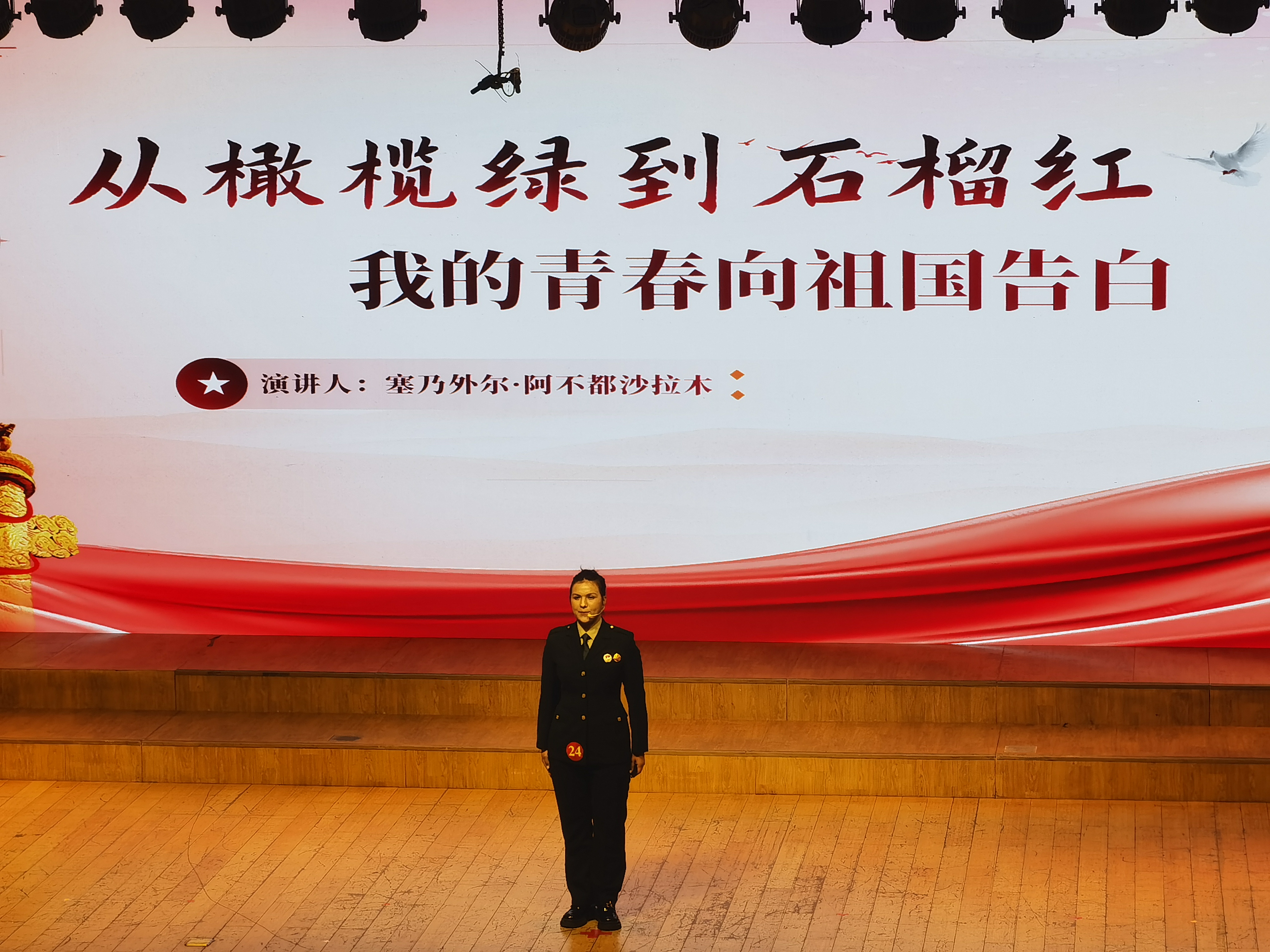 在全国决赛的舞台上,塞乃外尔·阿不都沙拉木展现了其作为新时代青年大学生的卓越风采。从橄榄绿到石榴红,她结合自身宝贵的退伍士兵经历,以饱满的热情、清晰的逻辑和极具个人魅力的表达,生动诠释了对“概论金教材”精神内涵的深刻理解,深情讲述了将个人理想融入中华民族伟大复兴中国梦的青春故事,其演讲内容充实、情感真挚、视角独特,赢得了评委和观众的认可。