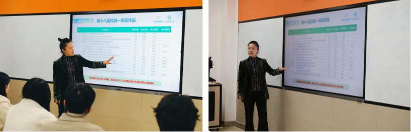 冯妍卉结合往届国赛中我校优秀比赛作品深入分析了作品申报书完善、创新点挖掘以及实物制作的细节与要求,强调要重点关注装置结构、创新点突出、科学性及合理性分析等,并依次对15支参赛队伍的作品进行了点评,提出了修改意见。